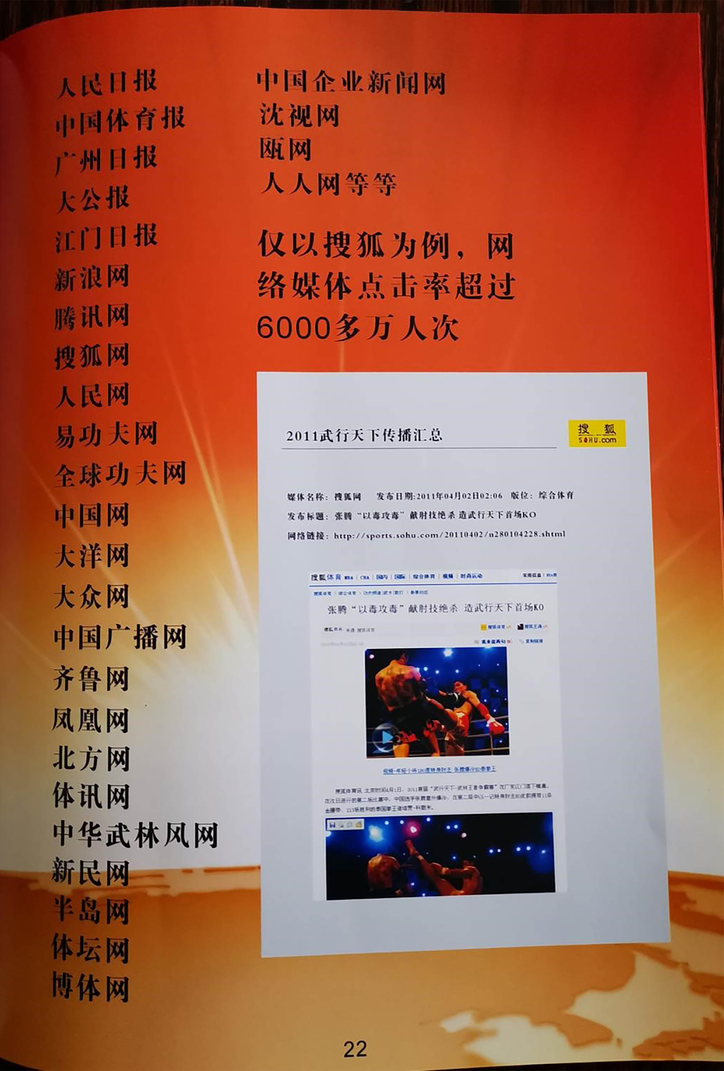 人民日报、中国体育报、广州日报、大公报、江门日报、新浪网、腾讯网、搜狐网、人民网、易功夫网、全球功夫网、中国网、大洋网、大众网、中国广播网、齐鲁网、凤凰网、北方网、体讯网、中华武林风网、新民网、半岛网、体坛网、博体网、中国企业新闻网、沈视网、瓯网、人人网等众多媒体铺天盖地的进行了鼓舞人心的报道,不仅创下了当日广东电视台、重庆电视台收视率冠军的记录,赛后仅以搜狐为例,网络媒体点击率超过6000多万人次。