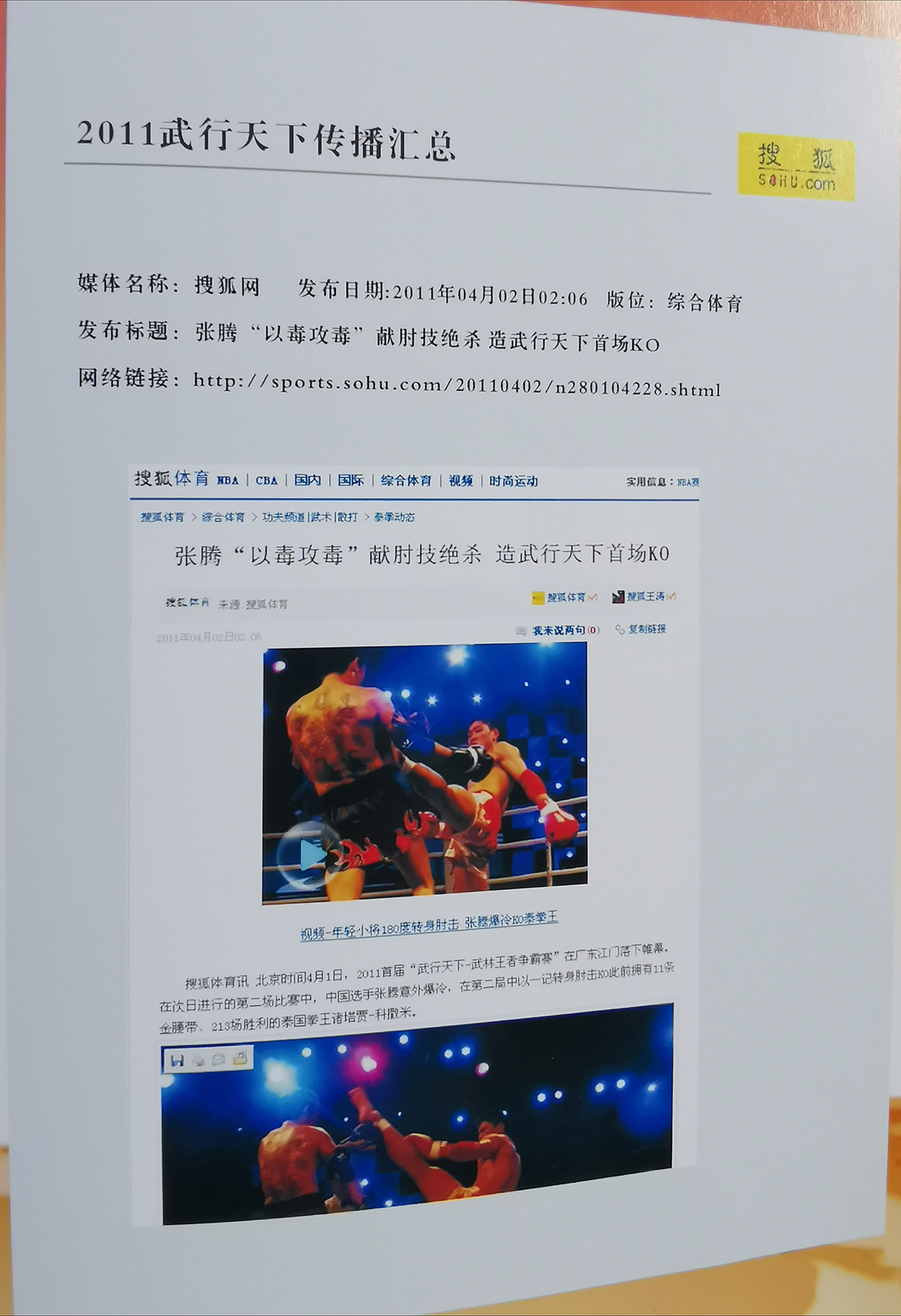 搜狐网于2011年4月2日2点6分在“综合体育”版发表了题为“张腾‘以毒攻毒’献肘技绝杀 造武行天下首场KO”的新闻报道。新闻中写到:北京时间4月1日,“武行天下·武林王争霸赛”在广东江门落下帷幕,在次日进行的第二场比赛中,中国选手张腾爆冷,在第二局中以一记转身肘击KO此前拥有11条金腰带、213场胜利 的泰国拳王诸塔贾·科撒米。