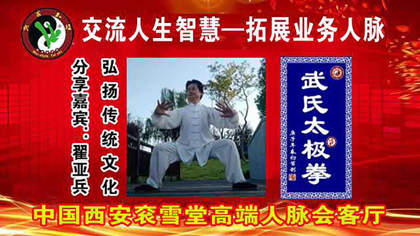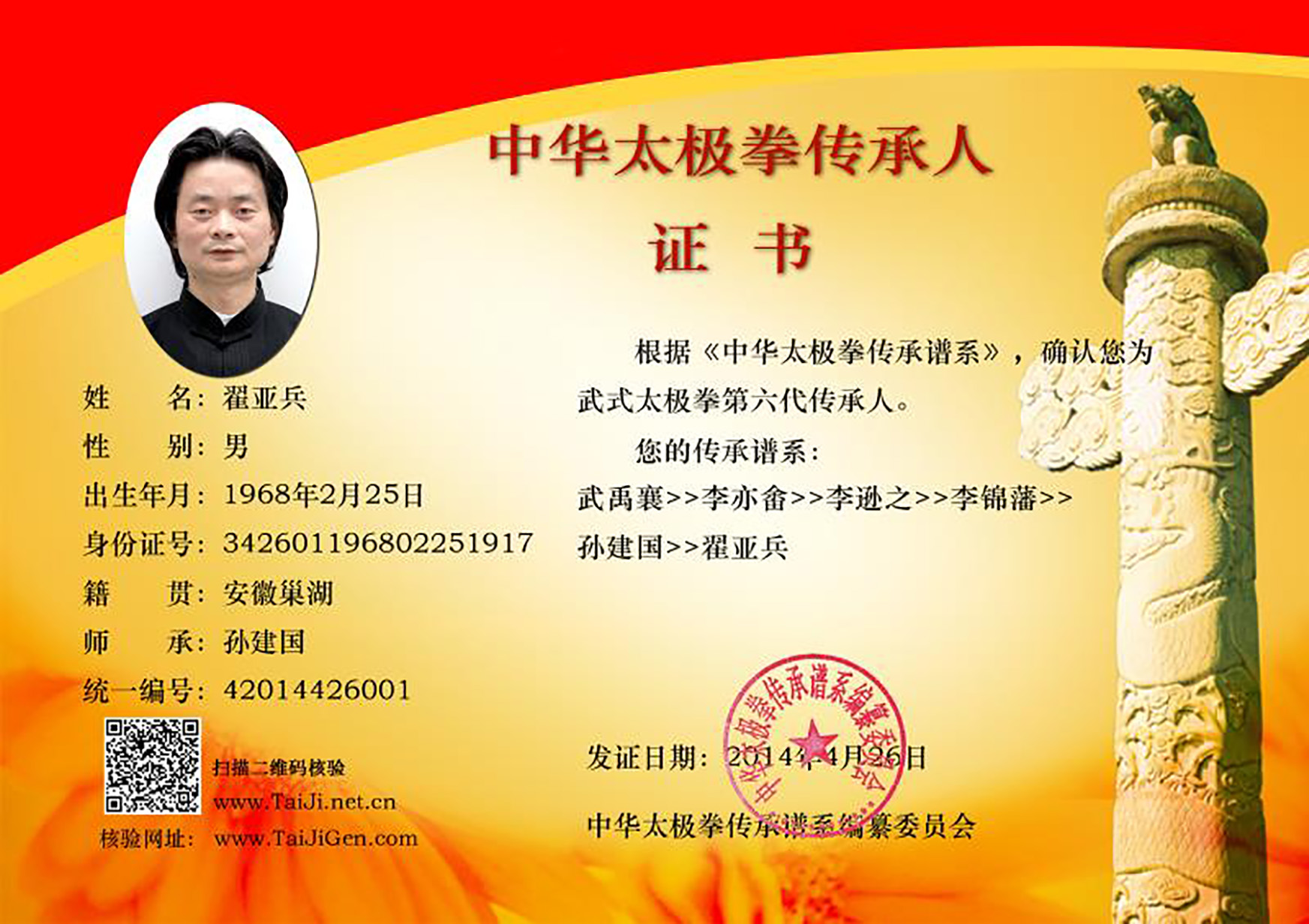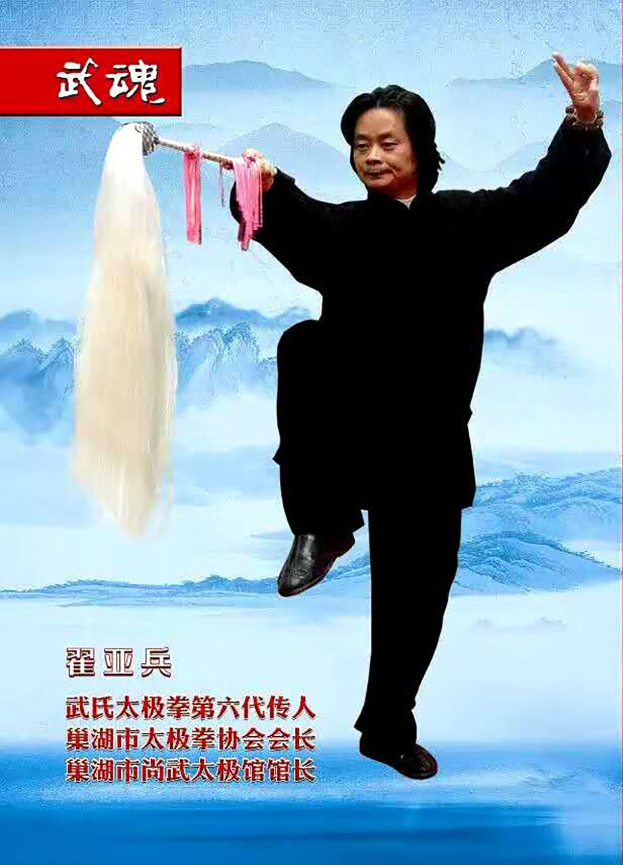 翟亚兵,安徽巢湖槐林花山村人,中国武氏太极拳第六代传人、师承武氏太极学院院长孙建国先生、武魂百杰、高级太极拳拳师、武术一级裁判、国家级社会体育指导员。曾多次参加国际、国内武术大赛,获拳、剑比赛金、银牌数十枚。先后在巢湖市政府、政协、公安、法院、税务等机关、以及学校、企业任教太极拳!曾担任巢湖市太极拳协会会长,教授太极拳学生数以千人。其习武事迹入编《中国武术文化传承人物》、《中国文学出版社—践行者-时代楷模》、《走向世界的中国武术名家》,以及太极网、世界太极网等武林杂志时常报道!