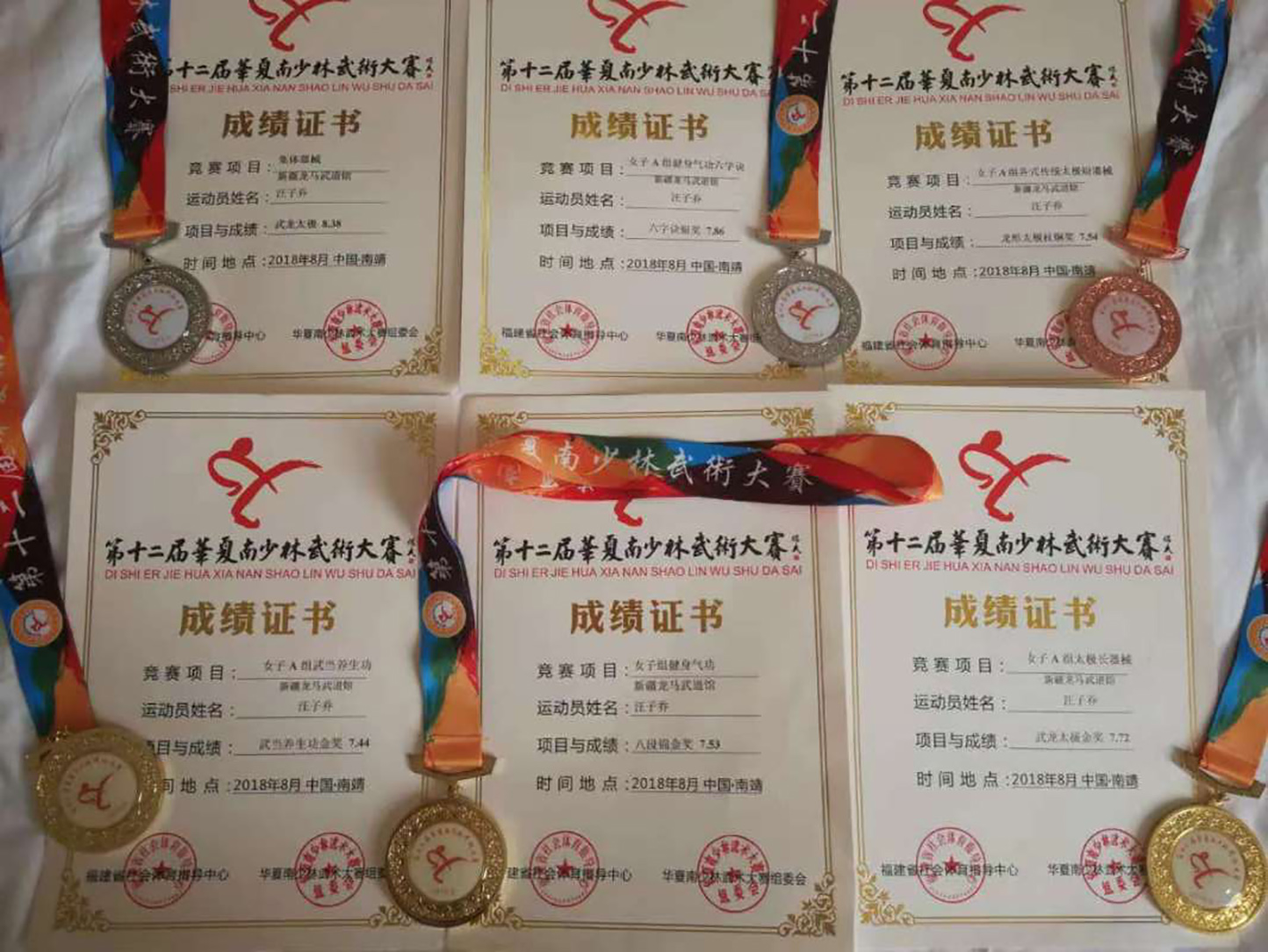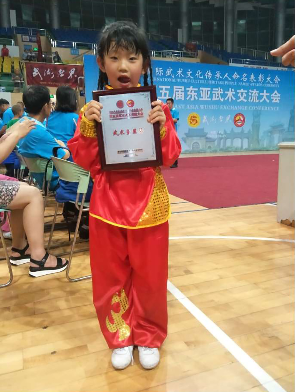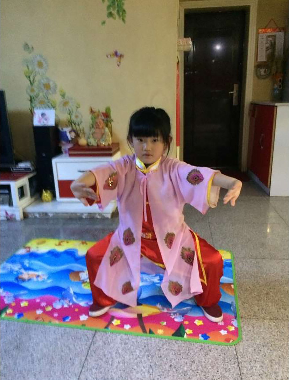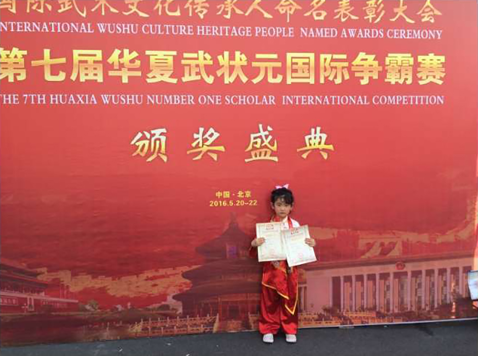 汪子乔,女,2011年4月18日出生。三岁半开始引导习练基本功“五心朝天”并学习武当养生功,2016年5岁参加新乡首届万仙山国际武术赛获童星奖。2017年第七届华夏国际争霸赛获一金一银,并获童星奖。2017参加第五届东亚武术赛获4枚金牌。2018年第十二届华夏南少林武术大赛获4枚金牌1枚银牌。
