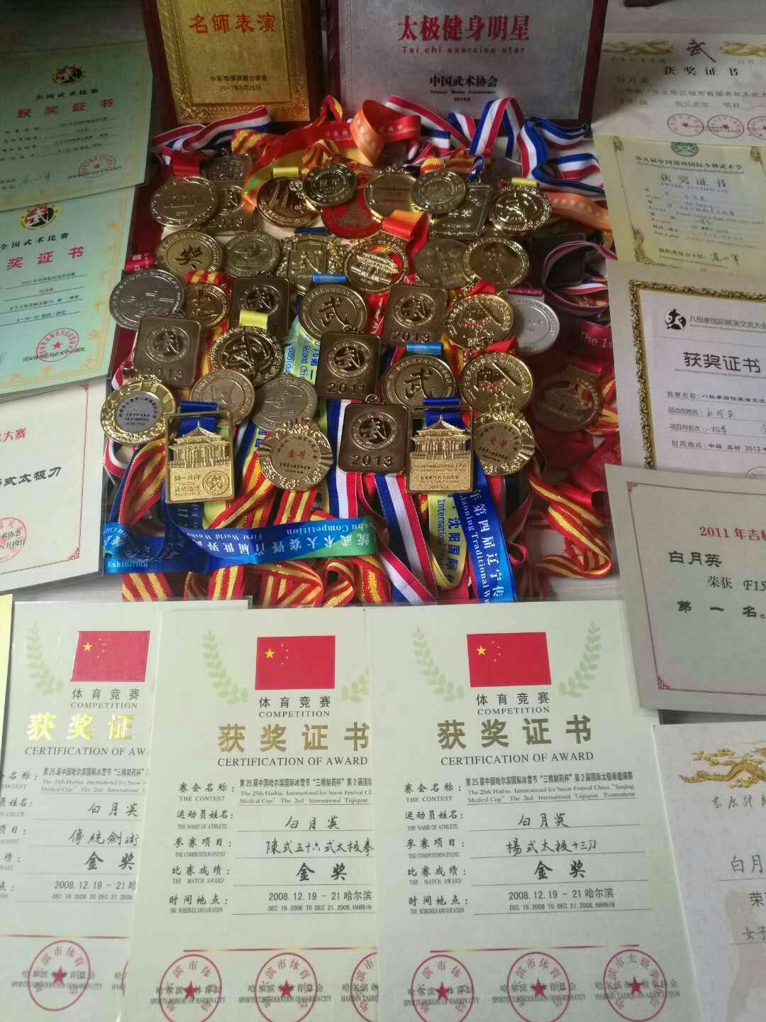 1999年参加山西省第十九届传统武术锦标赛获的拳剑***.2008年参加哈尔滨第二届国际太极拳大赛获拳.剑.刀***.2011年参加西安全国传统武术比赛获拳剑一等奖.河南登封全国首届少林拳比赛少林拳***.2012年第九届郑州国际少林武术节获的拳.春秋大刀***.2013年八极拳国际交流大赛拳.长器械获金奖.2013年徐州全国武术比赛获的全国女孑组三项***.2014年第十二届邯郸国际太极拳大赛获的优秀教练武德风尚奖.评为太极健身名明星.2016年河北临西弹腿大赛获的优秀裁判长称号.2017年被聘为马来西亚国际武术裁判.获的优秀裁判长称号同吋评为国际武术名家.多次授邀到曰本.韩国.新加波进行武术交流活动.为传统武术的推广.弘扬中华武德.武术精神做出了卓越贡献。