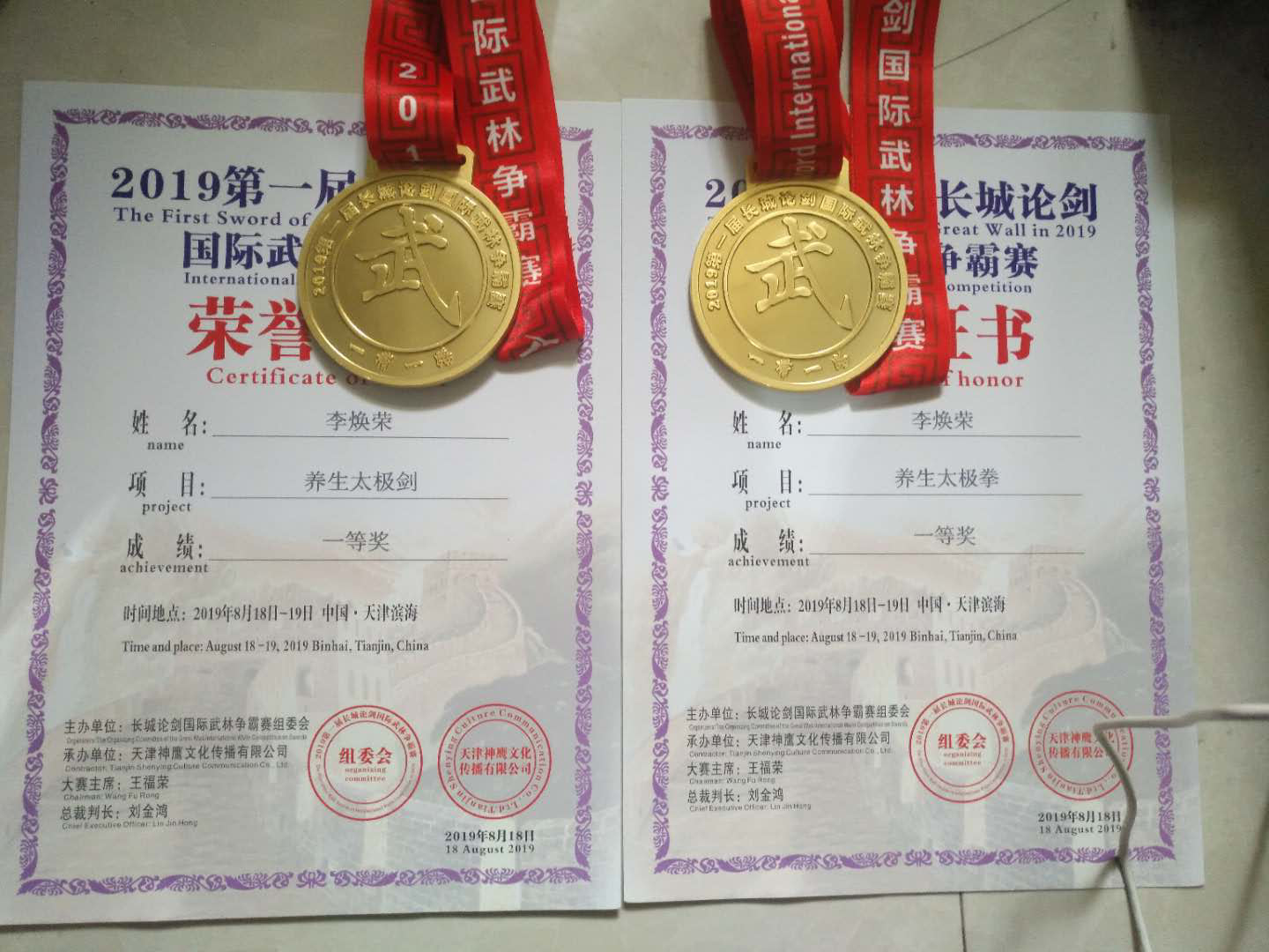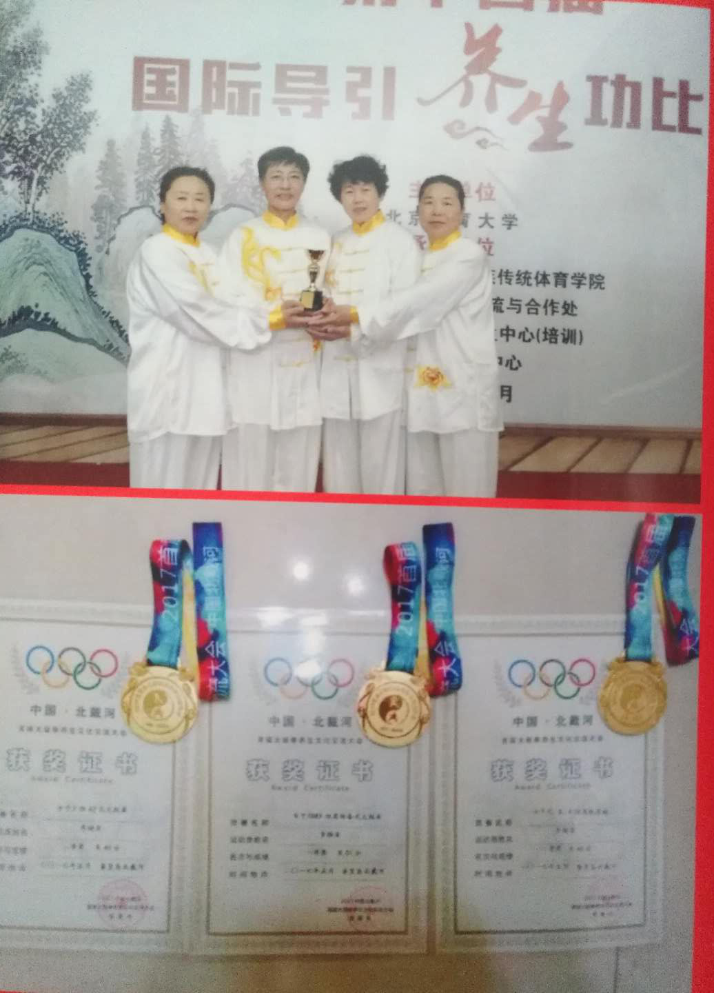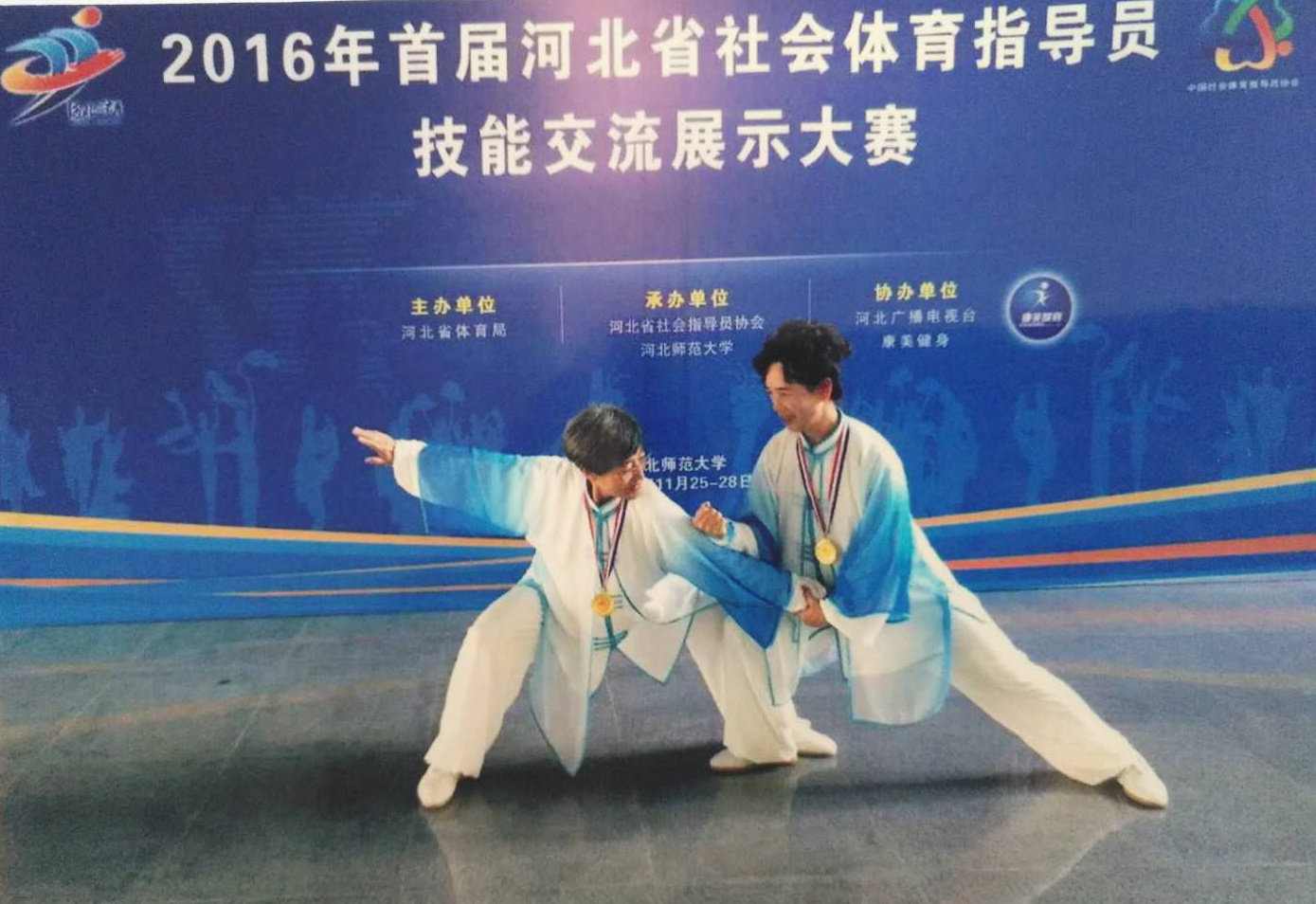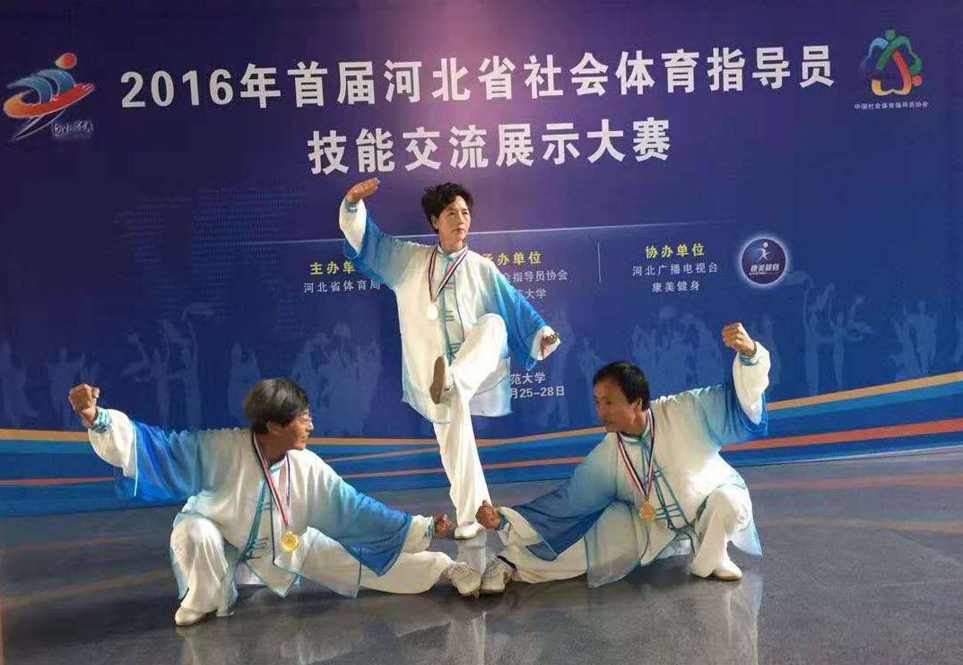2016年4月参加“桑化科技杯”北京体育大学第十三届国际导引养生功养生太极团体第一名,奖杯一个,证书个人项目三项金牌,2016年6月19日参加河北省健身气功站点联赛团体两项第二名,奖杯证书,2016年8月参加山东省济南市国际武术技能大赛个人项目三项金牌,三枚证书奖杯,2016年11月首届河北省社会体育指导员技能交流展示大赛集体项目拳、剑、健身气功三项第一名,金牌三枚,2017年5月参加中国北戴河首届太极拳养生文化交流大会个人项目三项拳、剑、掌第一名,金牌三枚,证书,2018年4月参加北京体育大学第十四届国际导引养生功,健身气功团体第一名,证书、奖杯,个人项目两项第一名,一项第二名,银牌一枚,金牌两枚,2018年7月参加山东省第三届武术精英大赛,个人项目,一金一银,2018年8月第一届新时代航母论剑华夏武林争霸赛,天津航母武术太极比赛,个人两项第一名,团体第一名,金牌三枚,奖杯证书,2019年第一届长城论剑国际武林争霸赛,拳、剑个人项日两项第名,金牌两枚。