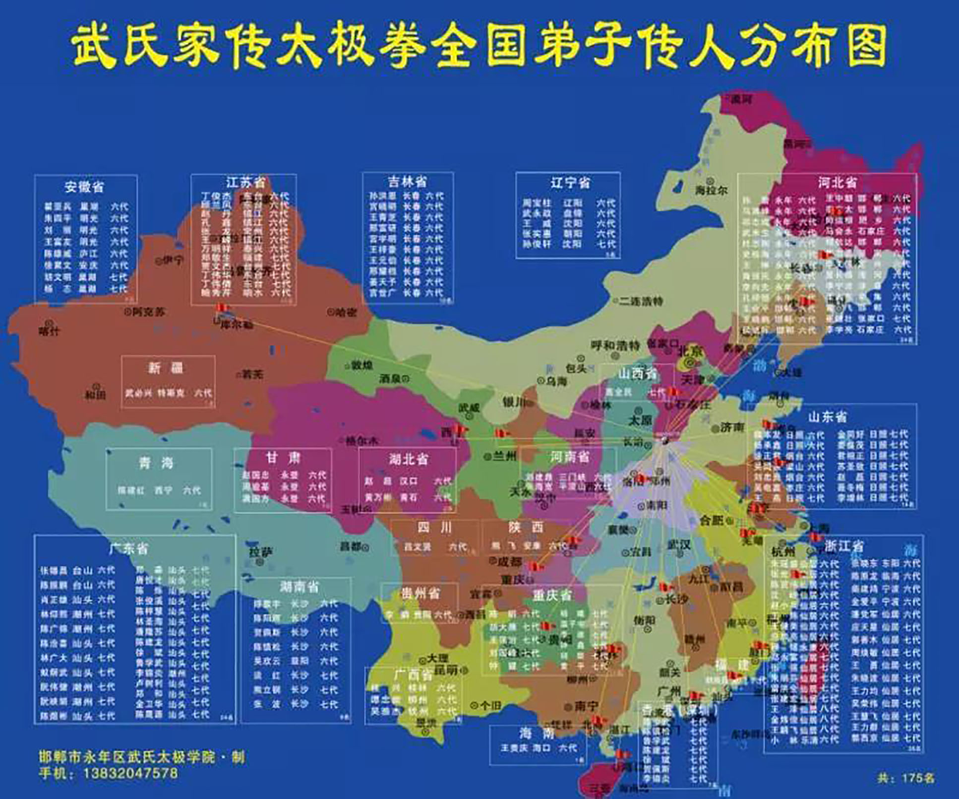 截止2017年11月,已经有正式拜师徒弟178位。全国各地的弟子开设分院9处,其有山东日照,浙江仙居,安微巢湖,江西庐江,福建厦门,广东汕头,湖南长沙。重庆,贵州贵阳等等,学生上万名。