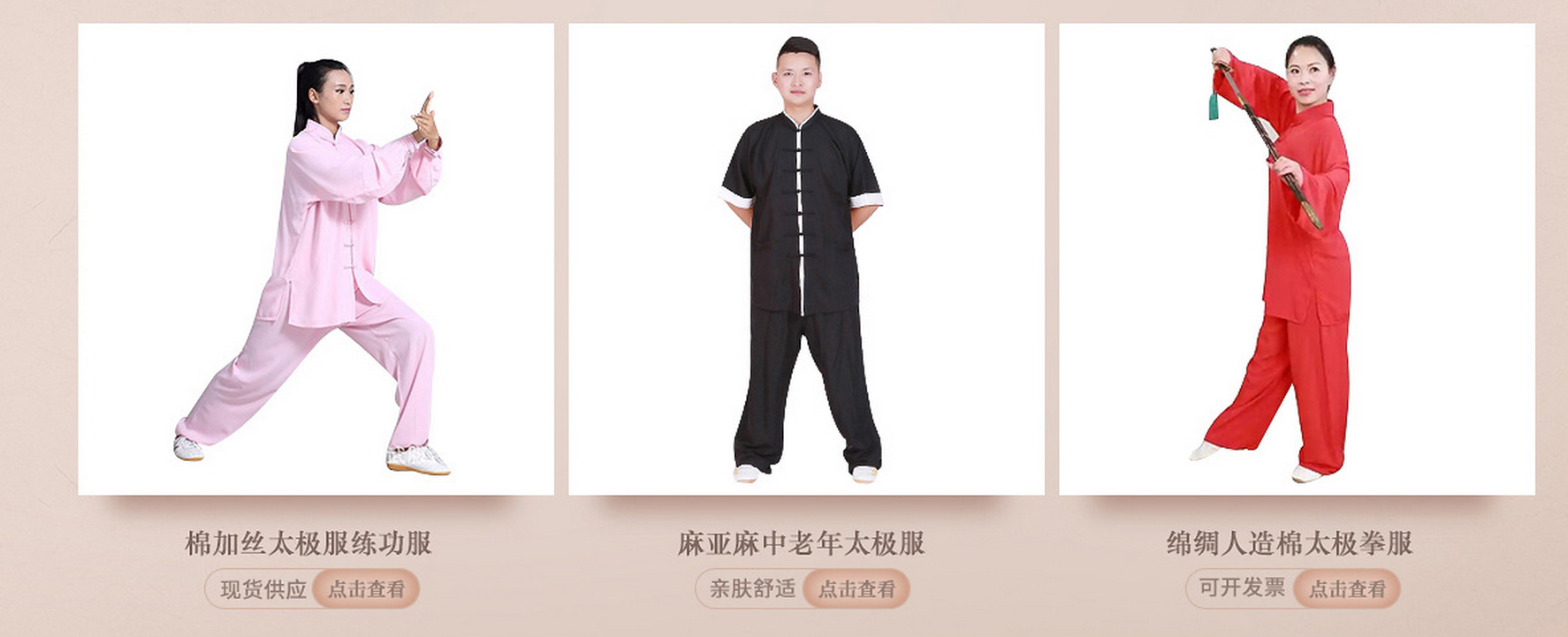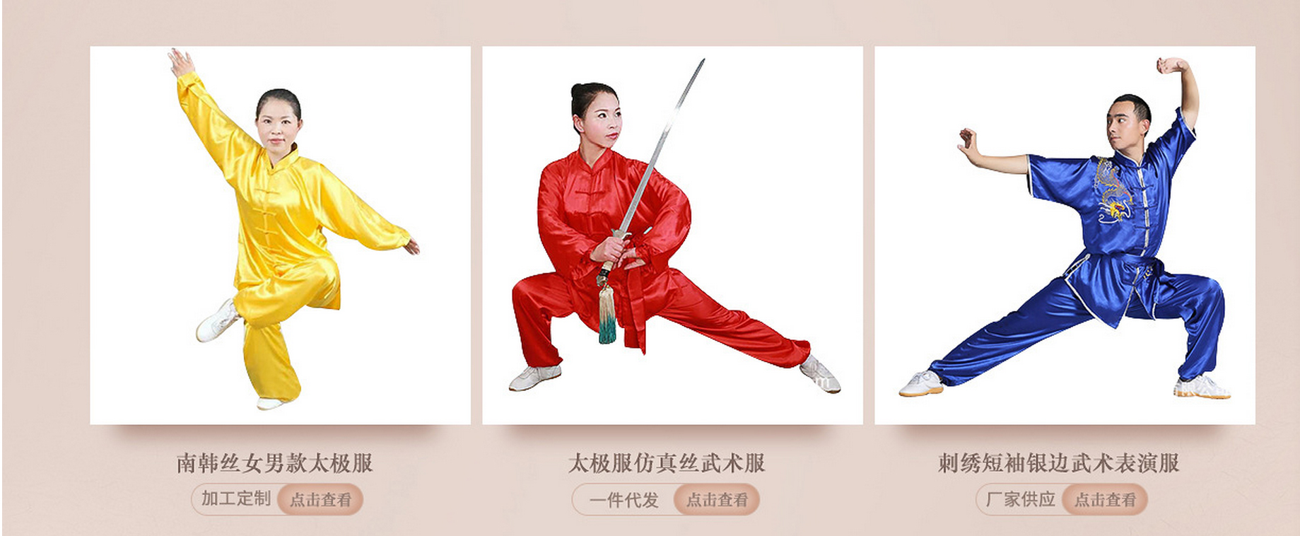多年以来,本厂本着质量第一,信誉第一的八字指导方针生产了大量的武术器材。其中包括太极服、和尚服、太极扇、跆拳道系列以及各种冷门兵器:刀、枪、剑、戢、斧、钺、钩、叉应有尽有。产品出口多个国家地区,赢得了各武术院校、体校以及知名人士的认同赞许。