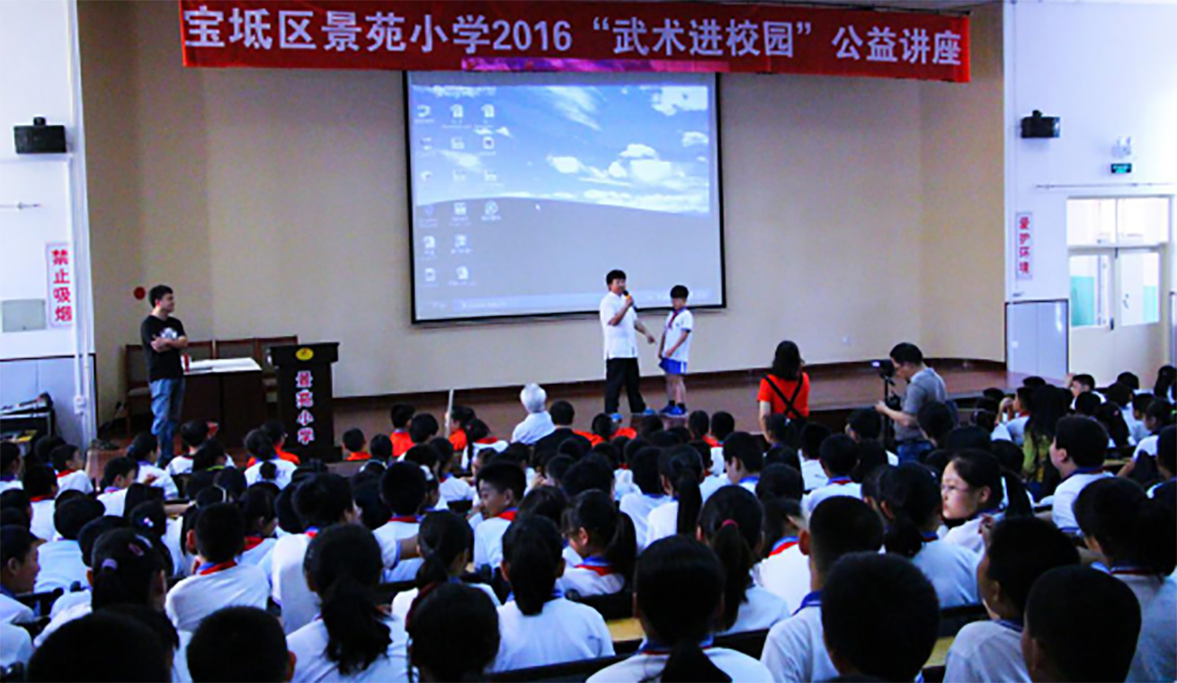 2016年5月,在景苑小学报告厅举办“武术进校园”公益讲座。