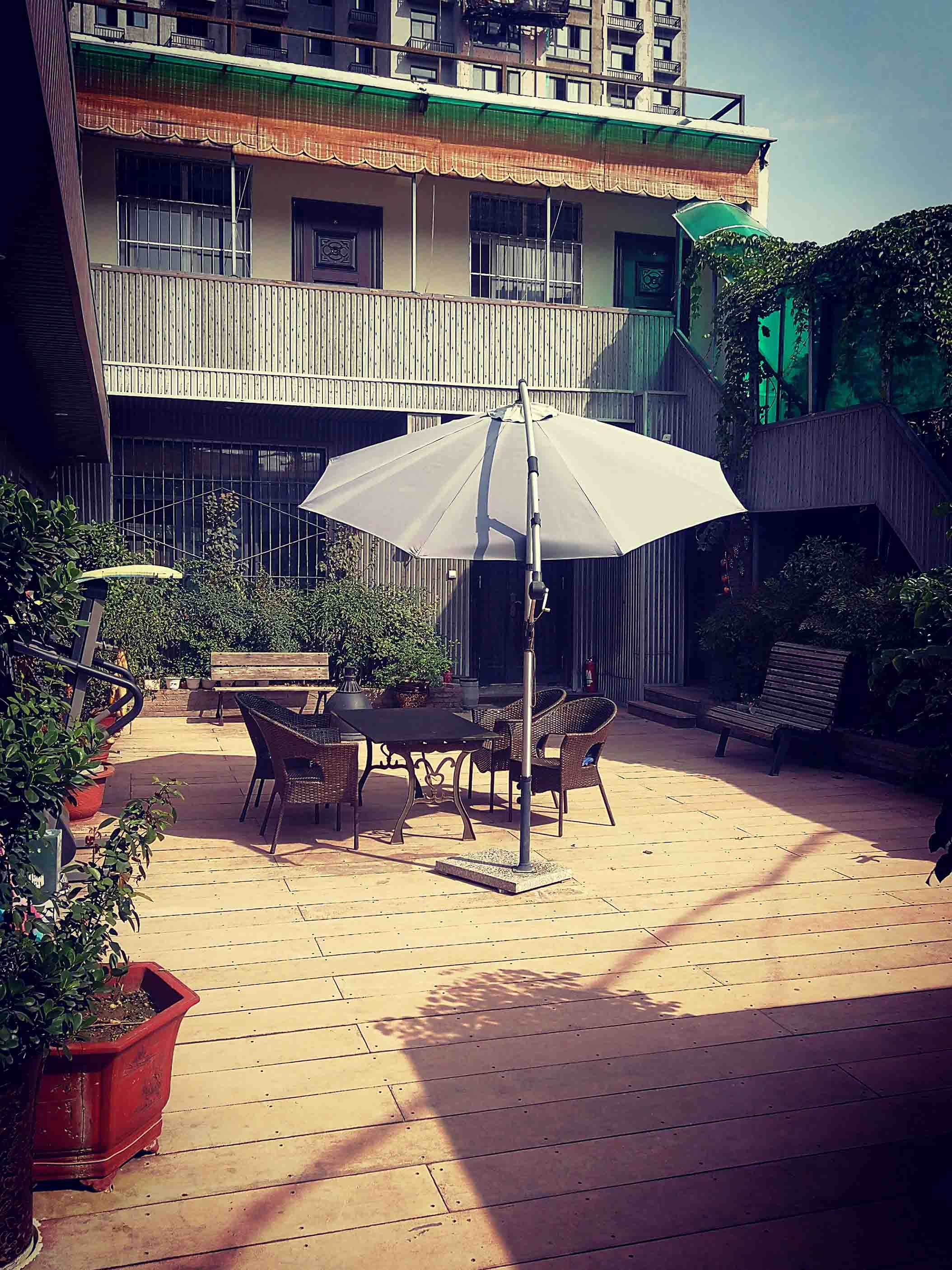 当练拳累了的时候,坐在木质条椅上,看着郁郁葱葱的绿竹,感到生活可以如此惬意,